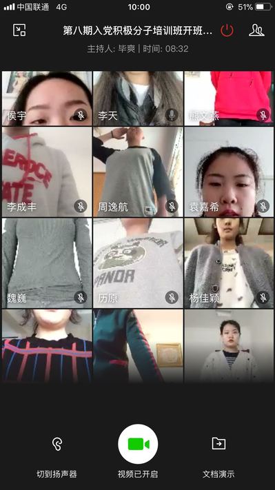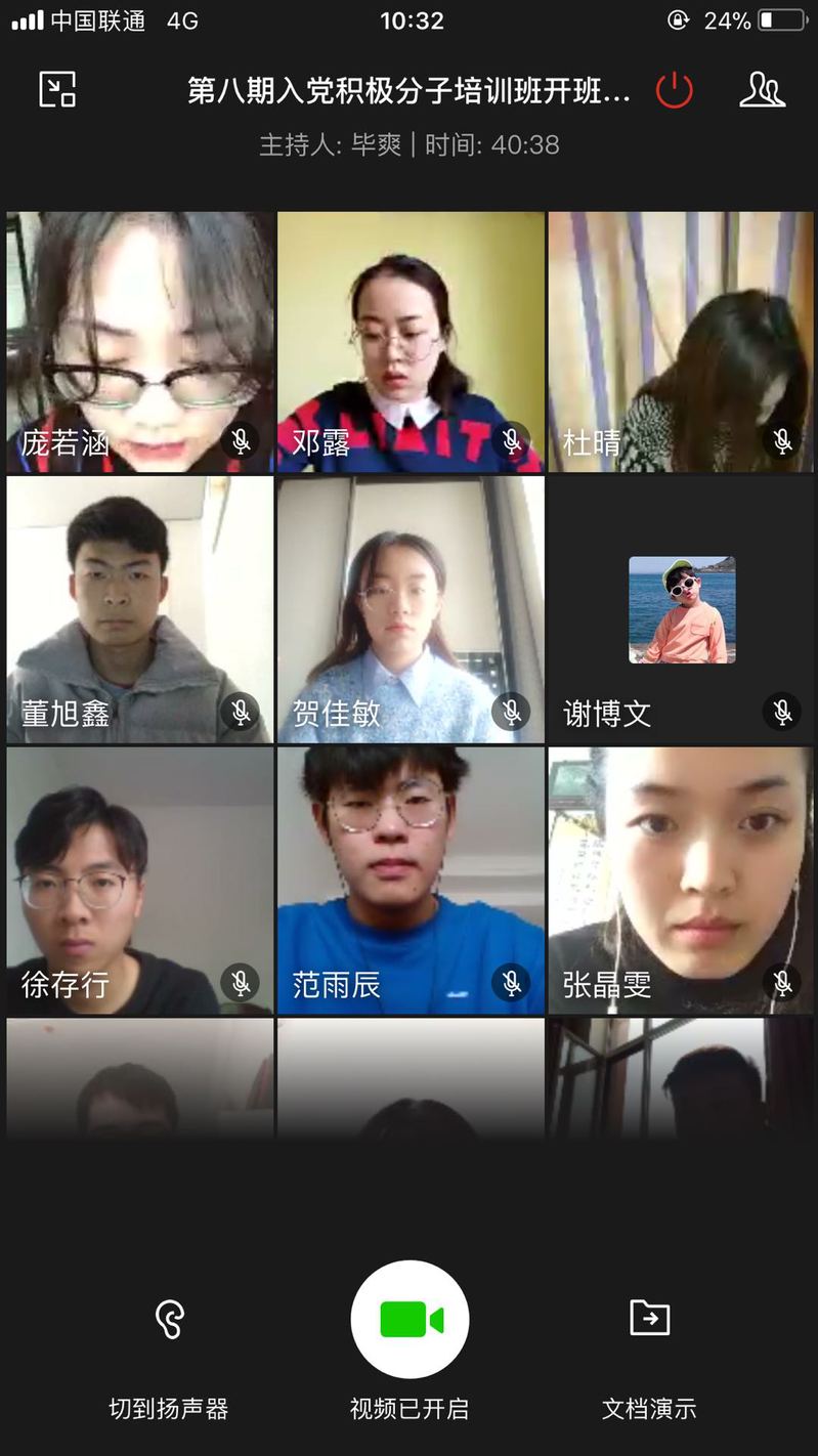 分党校第八期入党积极分子培训班开班仪式在线上举行。参加本次线上开班仪式的领导有:学院党委书记杨峰老师,学院党委专职组织员刘凤利老师,学院团委书记刘晓欣老师,学院专职辅导员刘丰硕老师。第八期学员全体参加开班仪式。学生党支部书记毕爽老师主持。