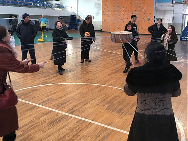 《击鼓颠球》游戏规则:每个部门出八名队员,没人抓两根绳的绳头或捏住把手,所有人一起颠球,颠球开始后球接触队员身体或落地即为停止,鼓和绳落地即为停止。如球落在绳上反弹回地面可以继续,但落绳上不计数。球颠起的高度不低于鼓面20厘米,否则不计数。颠球时间为两分钟,累计颠球数为最终成绩。