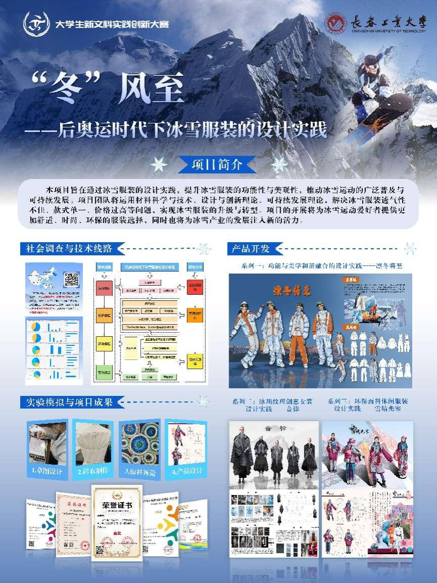 葛英颖教授指导的《“冬”风至——后奥运时代下冰雪服装的设计实践》项目,从参加决赛的26个省(自治区、直辖市)184所高校推送的404个项目中脱颖而出,荣获国赛银奖。