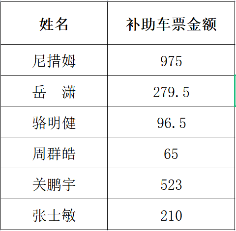 按照成人色情 关于发放2021年学生返乡爱心车票补助的通知,学院各年级摸底排查出确实存在返乡困难的学生,评选过程做到公平、公正、公开,现将评选结果公示如下。