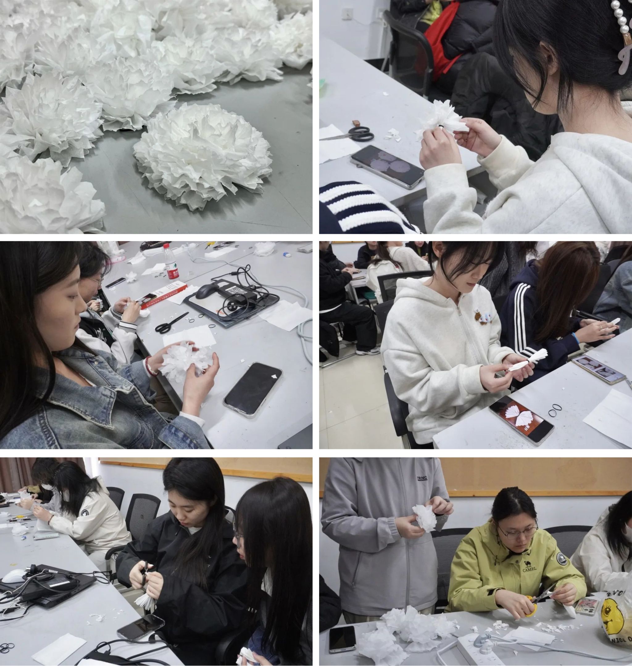 同学们充分发挥艺术设计专业的创造力与想象力,利用最简单的卫生纸和橡皮筋,通过巧妙地折叠、卷曲,最终形成一朵朵灵动素雅的胸花。制作过程中,大家相互交流创意,分享技巧,现场气氛既温馨又充满艺术创作的热情。